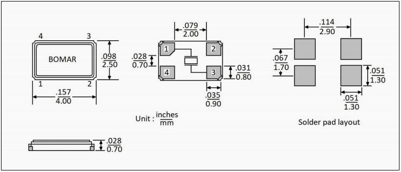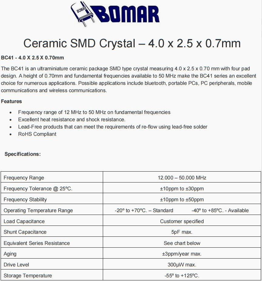 Bomar石英晶振,6G網(wǎng)絡(luò)傳輸晶振,BC41EFD120-24.000000四腳晶振,美國Bomar晶振公司,進口晶振,歐美晶振,SMD晶振,BC41晶振,小體積晶振,無源晶振,貼片晶振,四腳晶振,6G路由器晶振,6G信號接收器晶振,4025晶振,石英晶振,BC41是一款尺寸為4.0 x 2.5 x 0.70 mm的超微型陶瓷封裝SMD型晶體,采用四焊片設(shè)計。0.70mm的高度和50 MHz的基頻使BC41系列成為眾多應(yīng)用的絕佳選擇??赡艿膽?yīng)用包括藍(lán)牙、便攜式個人電腦、個人電腦外圍設(shè)備、移動通信和無線通信。