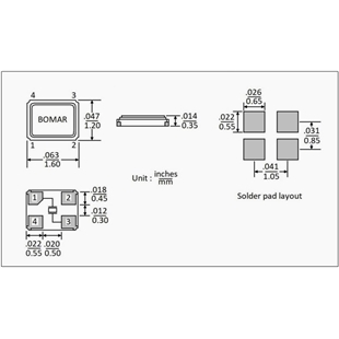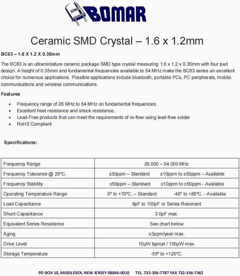 Bomar無源晶振,BC41EFD120-37.400000四腳晶振,無人機(jī)信號(hào)接收器晶振,美國Bomar晶振公司,進(jìn)口晶振,歐美晶振,BC63晶振,1612晶振,石英晶振,超小型晶振,無源晶振,貼片晶振,四腳晶振,6G路由器晶振,6G通訊設(shè)備晶振,BC63是一款尺寸為1.6 x 1.2 x 0.35mm的超微型陶瓷封裝SMD型晶體,采用四焊片設(shè)計(jì)。0.35mm的高度和54 MHz的基頻使BC63系列成為眾多應(yīng)用的絕佳選擇??赡艿膽?yīng)用包括藍(lán)牙、便攜式個(gè)人電腦、個(gè)人電腦外圍設(shè)備、移動(dòng)通信和無線通信