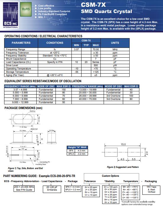 | ECS-200-S-5PX-TR | CSM-7X | 20MHz | ±50ppm | ±30ppm | Series |