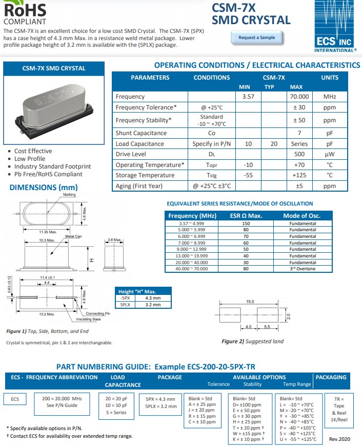 | ECS-50-20-5PX-TR | ECS Crystal | CSM-7X | 5MHz | -10°C ~ 70°C |