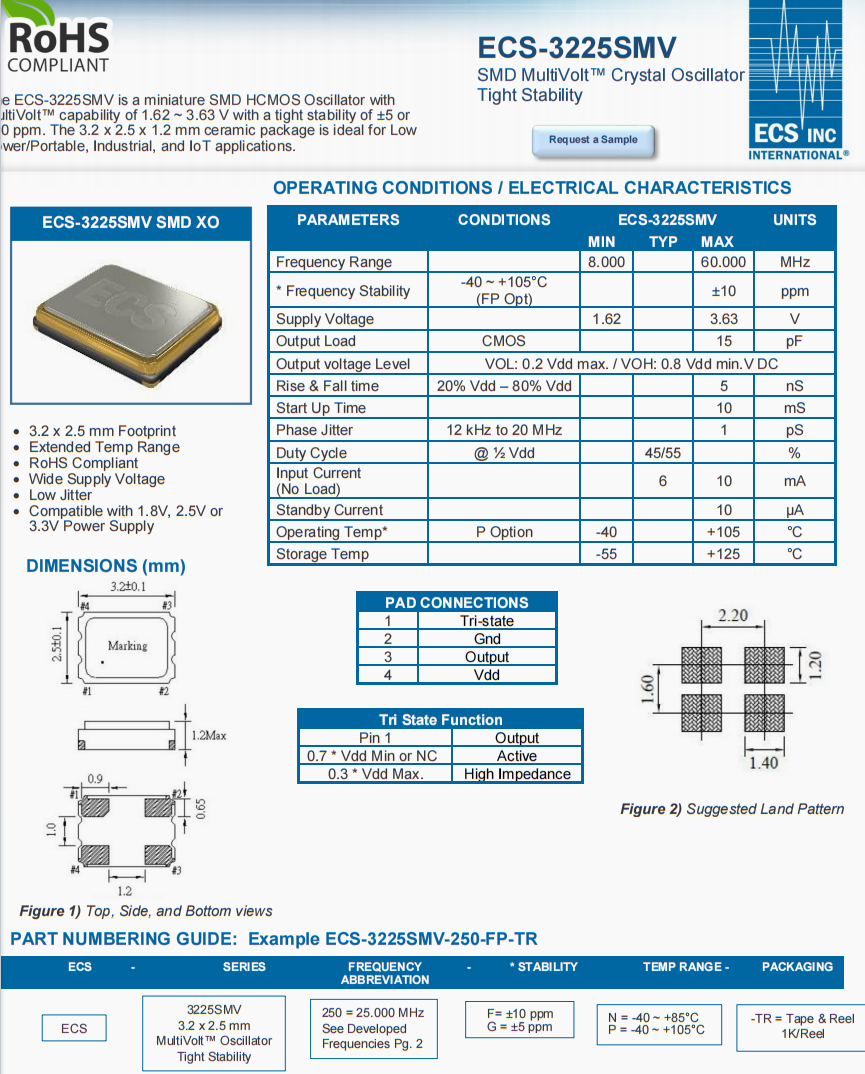 ECS-3225SMV-250-FP-TR晶振,進口ECS有源晶振,醫(yī)療設(shè)備晶振,美國ECS晶振公司,伊西斯無源晶振,ECS-3225SMV-250-FP-TR晶振,25MHz晶振,3225晶振,超小型晶振,四腳貼片晶振,石英晶體諧振器,美國進口晶振,高精度晶振,耐高溫晶振,汽車電子晶振,工業(yè)設(shè)備晶振,物聯(lián)網(wǎng)晶振,COTS晶振.ECS-3225SMV是一款微型SMD HCMOS振蕩器,MultiVolt™能力為1.62 ~ 3.63 V,穩(wěn)定性為±5或±10 ppm。3.2 x 2.5 x 1.2 mm陶瓷封裝是低功耗/便攜式,工業(yè)和物聯(lián)網(wǎng)應(yīng)用的理想選擇。