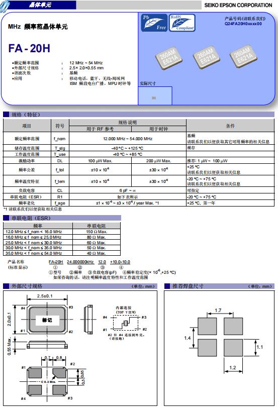| Q24FA20H00054 | 2.5 x 2 x 0.55mm | FA-20H | 24.000000 MHz | 12 pF | -20 to +75 °C |