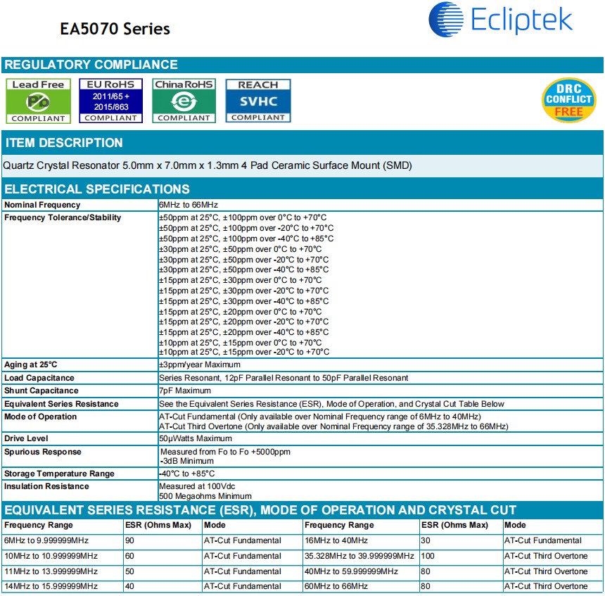 | EA5070JA16-6.000M | SMD Ceramic 5.0mm x 7.0mm | ±20ppm | -40°C to +85°C |