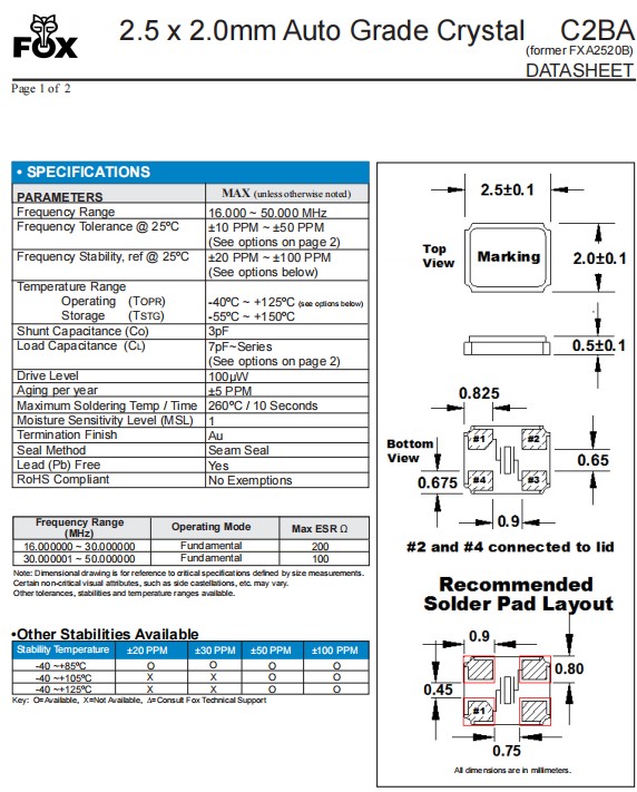 | FC2BACBEI25.0-T3 | Fox 晶振 | C2BA | 25 MHz | ±50ppm | ±30ppm | 10pF |