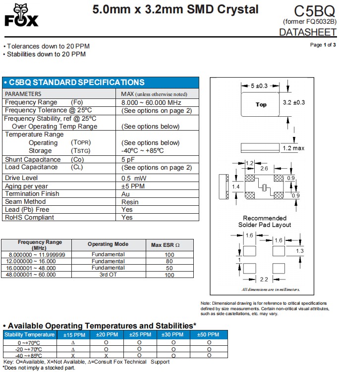 | FC5BQCCMC18.432-T1 | Fox 晶振 | C5BQ | 18.432 MHz | ±30ppm | ±30ppm | 20pF |