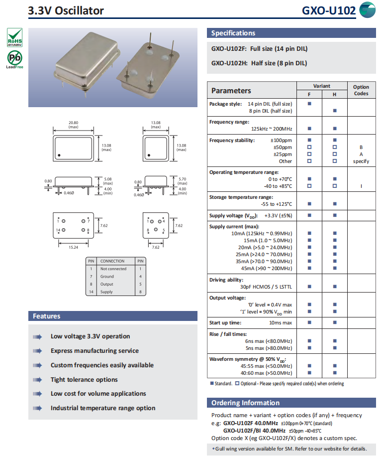 GXO-U102F/AI 20.0MHz晶振,GOLLEDGE長方形鐘振,汽車探測雷達晶振,英國高利奇晶振公司,進口晶振,有源晶振,插件晶振,長方形鐘振,高精度晶振,石英晶體振蕩器,耐高溫晶振,移動通訊晶振,汽車探測雷達晶振,6G晶振,6G網(wǎng)絡(luò)終端晶振,啟用/禁用三狀態(tài)模式,高驅(qū)動能力-高達50pF,定制頻率很容易獲得,批量應(yīng)用的低成本,工業(yè)溫度范圍選擇
