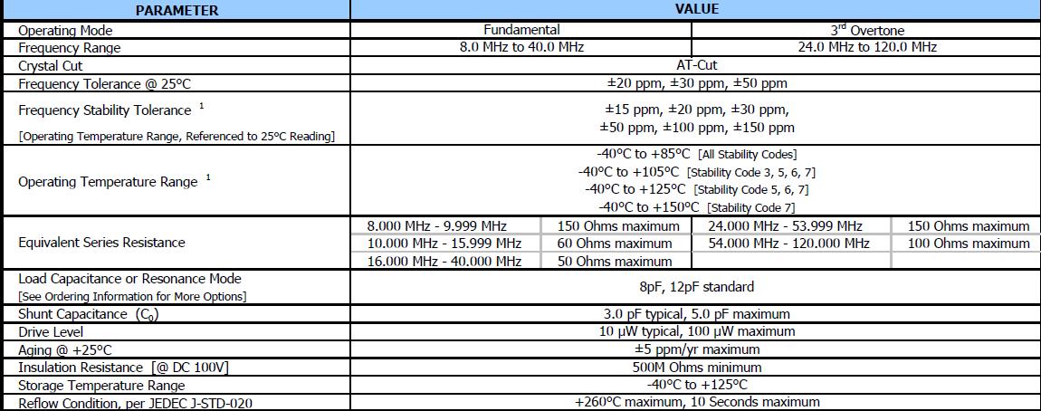 AEC-Q200兼容,標(biāo)準(zhǔn)5.0毫米x 3.2毫米玻璃密封包,基本晶體設(shè)計(jì),頻率范圍8 - 40 MHz基本,24 - 120 MHz第三泛音頻率公差;±20 ppm,±30 ppm和±50 ppm,頻率穩(wěn)定度、參考訂購(gòu)信息,操作溫度,-40°C + 125°C標(biāo)準(zhǔn),磁帶和卷軸包裝標(biāo)準(zhǔn),eia - 481,通過(guò)無(wú)鉛認(rèn)證符合歐盟指令2011/65 /歐盟,無(wú)鉛終止完成,豁免7(c)-我,電氣和電子元件含鉛玻璃(Pb).