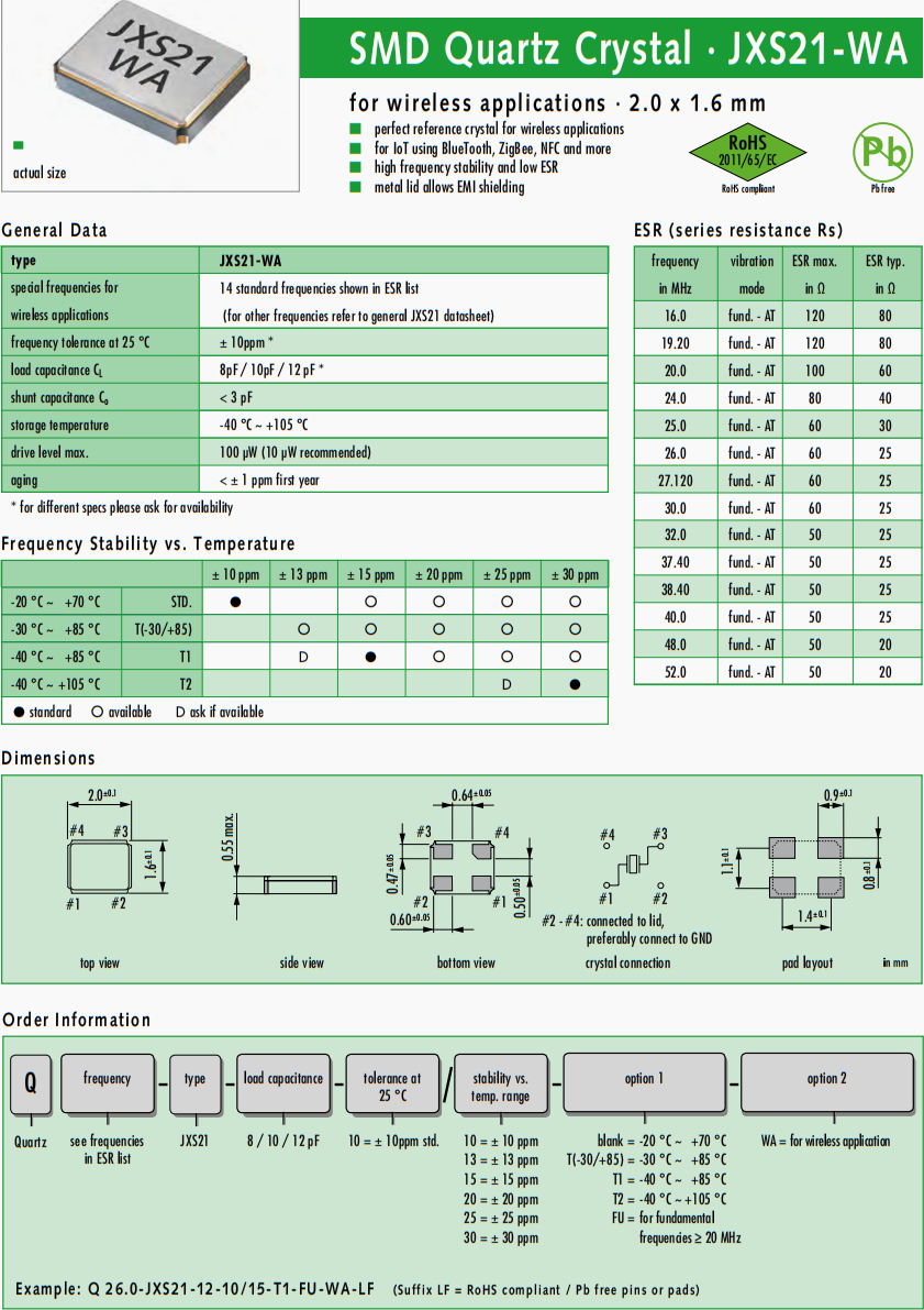 | Q 20.0-JXS21-12-10/10-FU-WA-LF | Jauch晶振 | JXS21-WA | 20MHz | ±10ppm | 12pF |