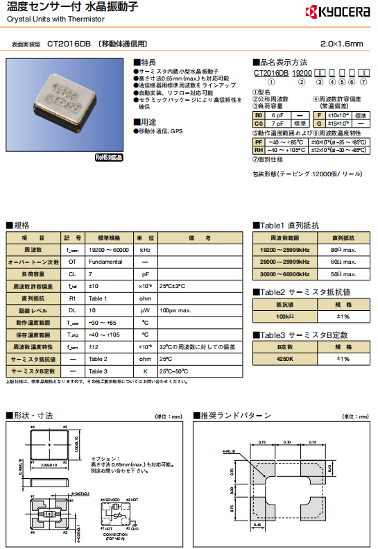 | CT2016DB19200C0FLHA1 | AVX 晶振/Kyocera 晶振 | CT2016DB | 19.2MHz | -30°C~85°C |