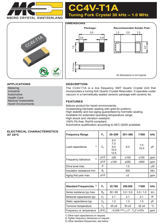 1.CC1V-T1A是一種低頻SMT石英晶體單元結(jié)合了一個音叉石英晶體諧振器,它在真空環(huán)境下工作,采用密封陶瓷包裝與陶瓷蓋