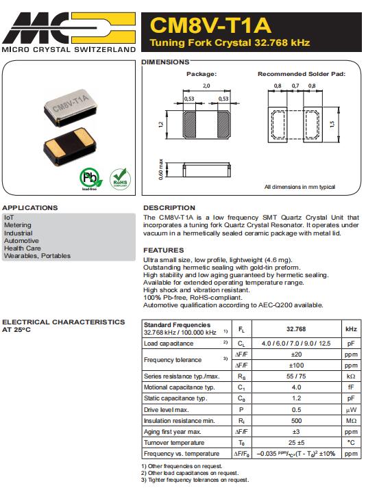 | CM8V-T1A-32.768k-12.5pF-20PPM-TA-QA | Micro 晶振 | 晶體 32.768 kHz 12.5 pF +/-20 PPM AEC-Q200 |