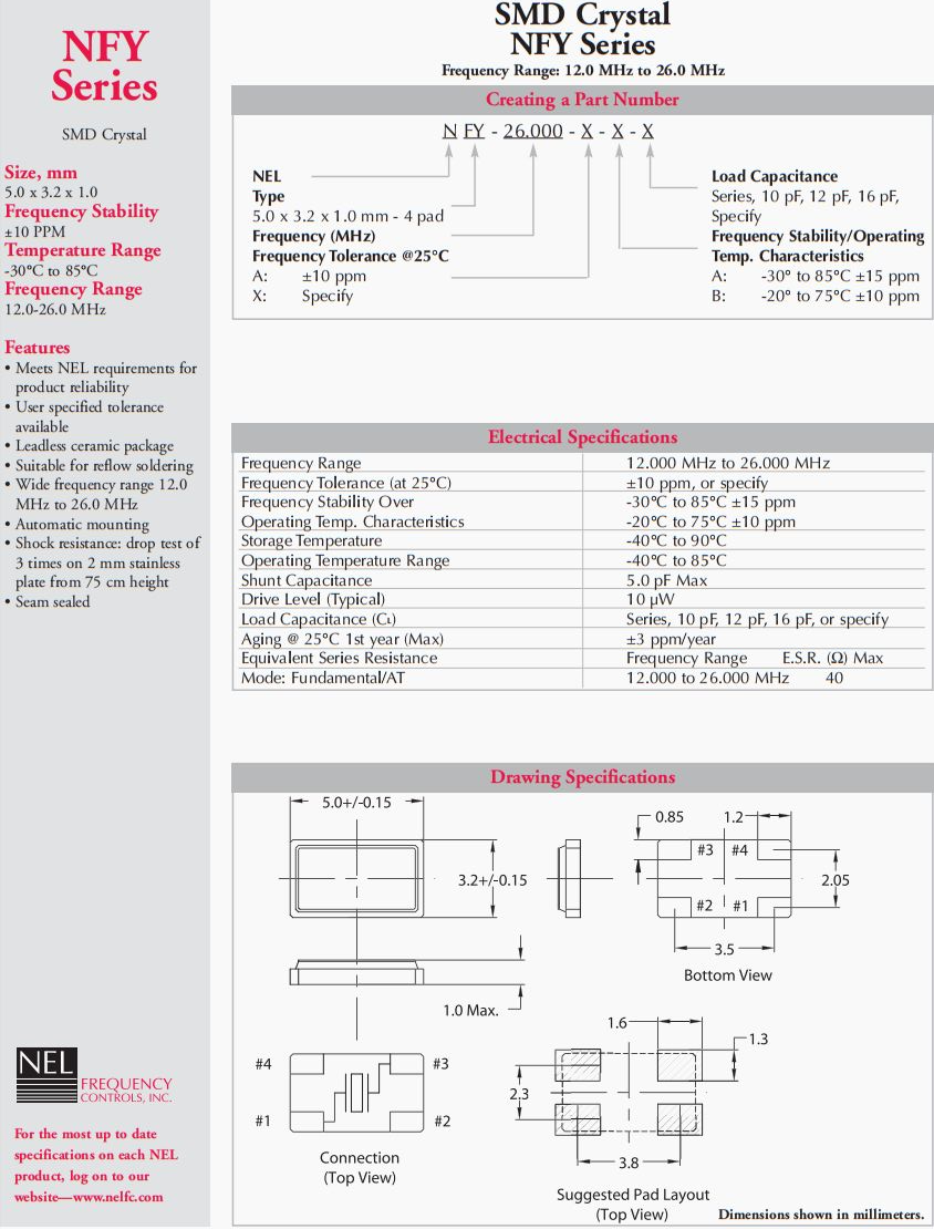 NEL耐爾晶振,6G信號放大器晶振,NFY-15.000-AA12PF貼片晶振,歐洲NEL晶振公司,歐美晶振,石英晶振,進口晶振,貼片晶振,高品質(zhì)晶振,耐環(huán)境晶振,耐沖擊晶振,無源晶振,環(huán)保無鉛晶振,產(chǎn)品可靠性符合NEL要求,用戶指定公差,無鉛陶瓷封裝,適用回流焊,寬頻率范圍12.0MHz至26.0 MHz,自動安裝防震:在2mm不銹鋼板上從75 cm高度開始進行3次跌落試驗,符合國際標準