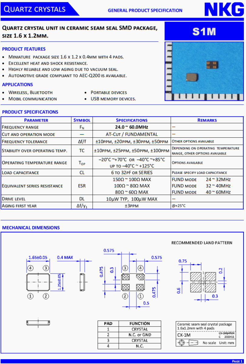 NKG高品質(zhì)晶振,汽車多媒體系統(tǒng)晶振,S1M25.0000F18E23-EXT超小型晶振,NKG晶振公司,無源晶振,貼片晶振,超小型晶振,1612晶振,汽車多媒體設(shè)備晶振,6G通訊設(shè)備晶振,6G網(wǎng)絡(luò)終端晶振,無源晶振,貼片晶振。石英晶體單元在陶瓷縫密封SMD封裝,尺寸1.6 x 1.2mm。產(chǎn)品特點(diǎn):微型包裝尺寸1.6 x 1.2 x 0.4mm,有4個(gè)襯墊。優(yōu)異的耐熱性和抗震性。真空密封,可靠性高,老化率低。符合AEC-Q200標(biāo)準(zhǔn)的汽車級(jí)產(chǎn)品可供選擇。應(yīng)用范圍:無線、藍(lán)牙、移動(dòng)通訊、便攜設(shè)備、USB存儲(chǔ)設(shè)備