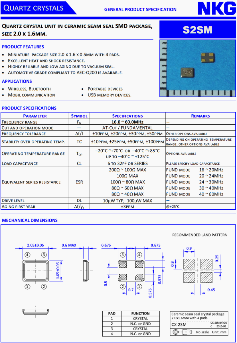 NKG超小型晶體,胎壓監(jiān)測裝置晶振,S2SM24.5760F12MYY-EXT貼片晶振,NKG晶振公司,無源晶振,貼片晶振,超小型晶振,2520晶振,液晶儀表盤晶振,石英晶振,耐高溫晶振,汽車多媒體設備晶振,6G通訊設備晶振,6G網絡終端晶振,無源晶振,貼片晶振。石英晶體單元在陶瓷縫密封SMD封裝,尺寸25. x 2.0mm。產品特點:微型包裝尺寸2.5 x 2.0 x 0.5mm,有4個襯墊。優(yōu)異的耐熱性和抗震性。真空密封,可靠性高,老化率低。符合AEC-Q200標準的汽車級產品可供選擇。應用范圍:無線、藍牙、移動通訊、便攜設備、USB存儲設備