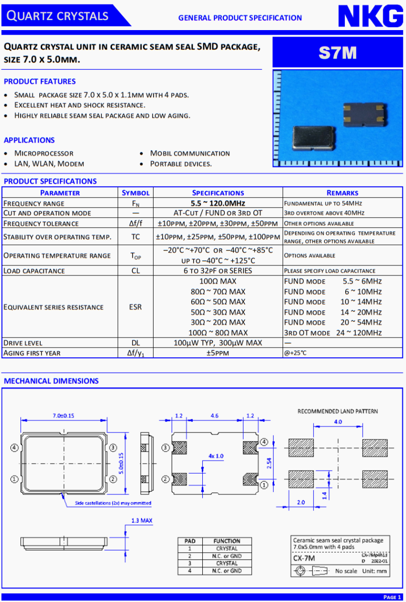 NKG7050晶振,S7M120.0000F18MYY-EXT晶振,車載氛圍燈晶振,。NKG晶振公司,無線傳輸晶振,汽車藍牙晶振,移動通訊晶振,石英晶振,石英晶體單元在陶瓷縫密封SMD封裝,尺寸7.0 x 5.0mm。S7M。產品特點:小包裝尺寸7.0 x 5.0 x 1.1mm, 4個襯墊。優(yōu)異的耐熱性和抗震性。高可靠的縫封封裝,低老化。應用:微處理器,局域網(wǎng),無線局域網(wǎng),調制解調器,移動通信,便攜式設備。高品質晶振,低損耗晶振,汽車級晶振,車載音響系統(tǒng)晶振,便攜設備晶振,USB存儲設備晶振。4025晶振,小體積晶振,超薄晶振,貼片晶振,進口晶振,