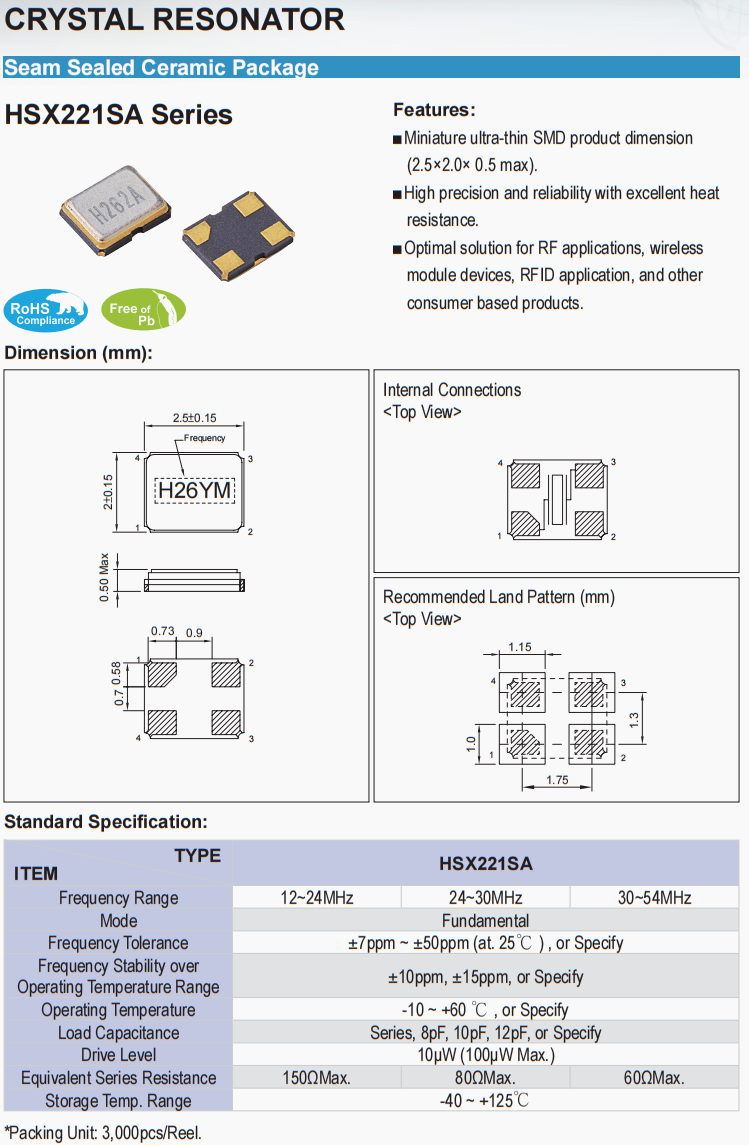 | 頻率容差 | ±7ppm ~ ±50ppm (at. 25℃ ) , or Specify | ||