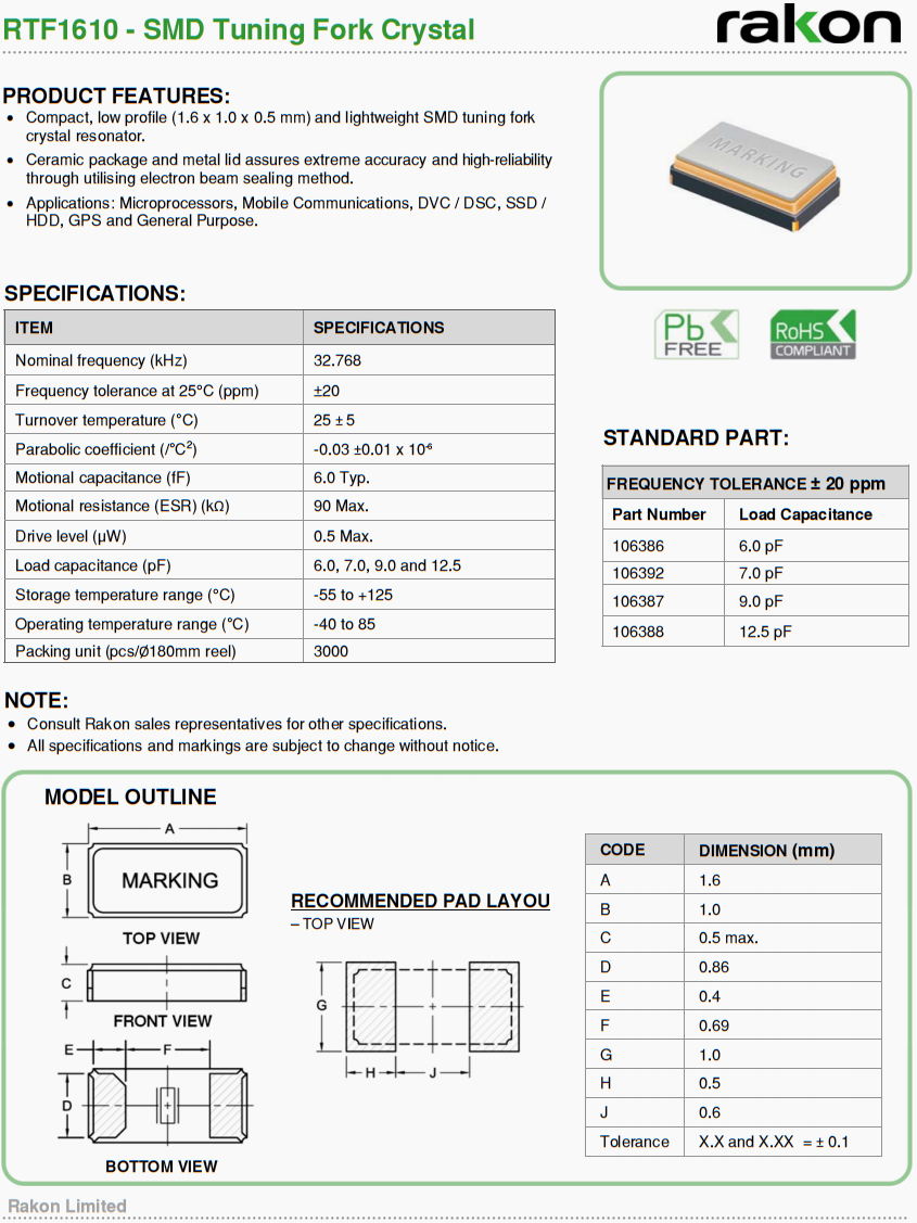 Rakon瑞康晶振,6G信號接收器晶振,RTF1610二腳晶振,新西蘭瑞康晶振,Rakon晶振,進口晶振,歐美晶振,6G信號接收器晶振,二腳晶振,32.768K晶振,石英晶振,貼片晶振,無源晶振,緊湊,低輪廓(1.6 x 1.0 x 0.5毫米)和輕量級SMD音叉晶體諧振器。陶瓷封裝和金屬蓋通過電子束密封方法確保極高的精度和高可靠性。應(yīng)用:微處理器,移動通信,DVC / DSC, SSD /HDD, GPS和通用。