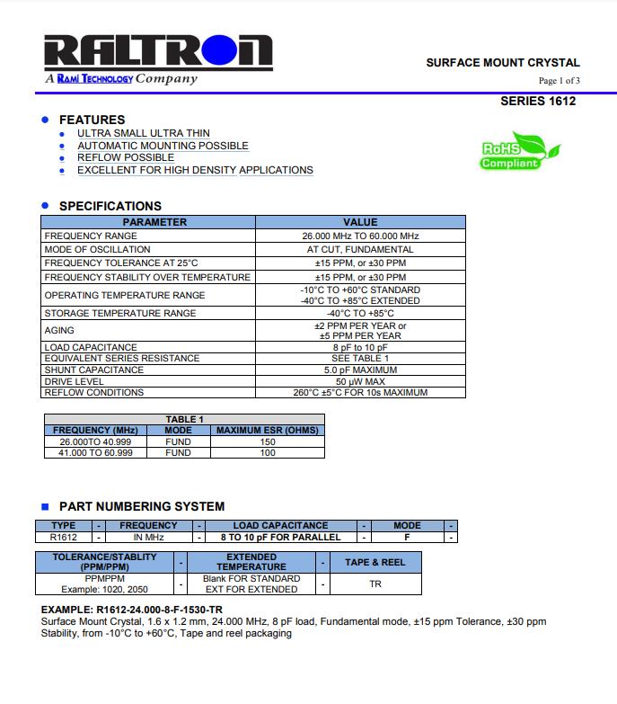 | Raltron原廠編碼 | 型號 | 頻率 | 尺寸 | 頻率偏差 | 頻率穩(wěn)定度 | 負載 |