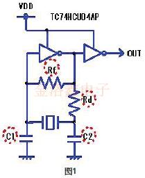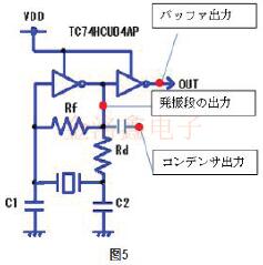 設(shè)計振蕩器電路時,有必要認(rèn)識到各個組件的作用.因此,表1中以振蕩電路(圖1)為例,以通用C-MOSIC(東芝74HCU04AP)為例說明了每個電路的作用.