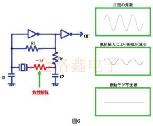 這是為了確認(rèn)晶振振蕩電路具有多少振蕩余量,并且根據(jù)所獲得的值來預(yù)測振蕩穩(wěn)定性的測量.如圖6所示,如果將一個電阻器(R)與振動器串聯(lián),并且該值增大,則振動器將不會在某個電阻值以上振蕩.即將停止振蕩之前的電阻值為負(fù)電阻值.