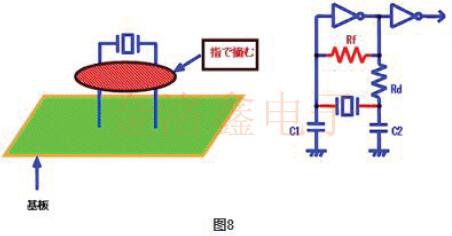 在要使用的振蕩電路中,檢查振蕩器是否可能以正常振蕩模式以外的其他模式振蕩.確定換能器的振蕩模式為基本模式時,確認(rèn)高振蕩模式(從基本振蕩到第三階諧波的容易性)的簡單方法如圖9所示.2),示波器的波形為3.如果沒有泛音振蕩,則可以判斷為沒有異常振蕩的可能性.相反,示波器波形為3.如果發(fā)生泛音振蕩,則可以確定存在異常振蕩的可能性.用浸水的手指檢查的原因是在換能器端子之間形成一個小的電阻,并在圖8的電路圖中減小Rf以便于在高頻范圍內(nèi)振蕩.