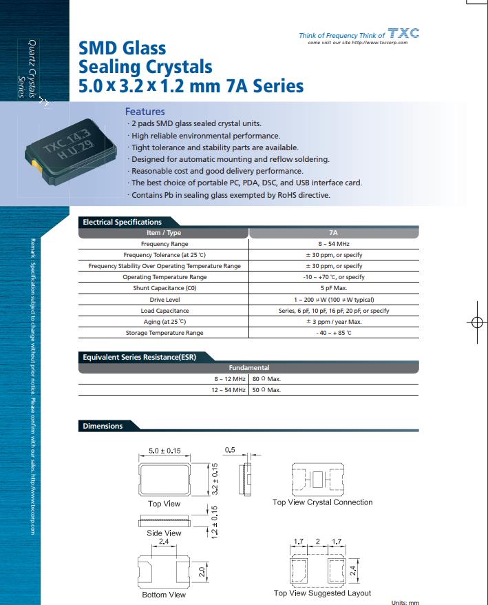 | 7A-24.000MAAE-T | TXC晶振 | 7A | 24MHz | ±30ppm | -20°C ~ 70°C |