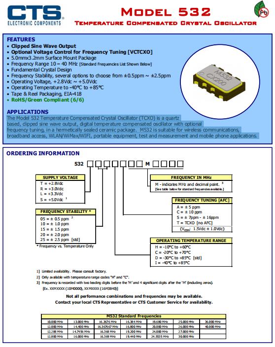 | 532L25DT26M0000 | CTS溫補晶振 | 532 | 26MHz | ±2.5ppm |