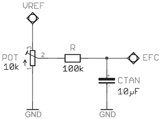 電位器POT應(yīng)該是低噪聲(金屬陶瓷或金屬薄膜)類(lèi)型,其電阻值必須選擇這樣,即不超過(guò)VREF輸出的最大允許電流損耗。10 kΩ在大多數(shù)情況下是合適的,強(qiáng)烈建議在VC輸入處附加濾波。