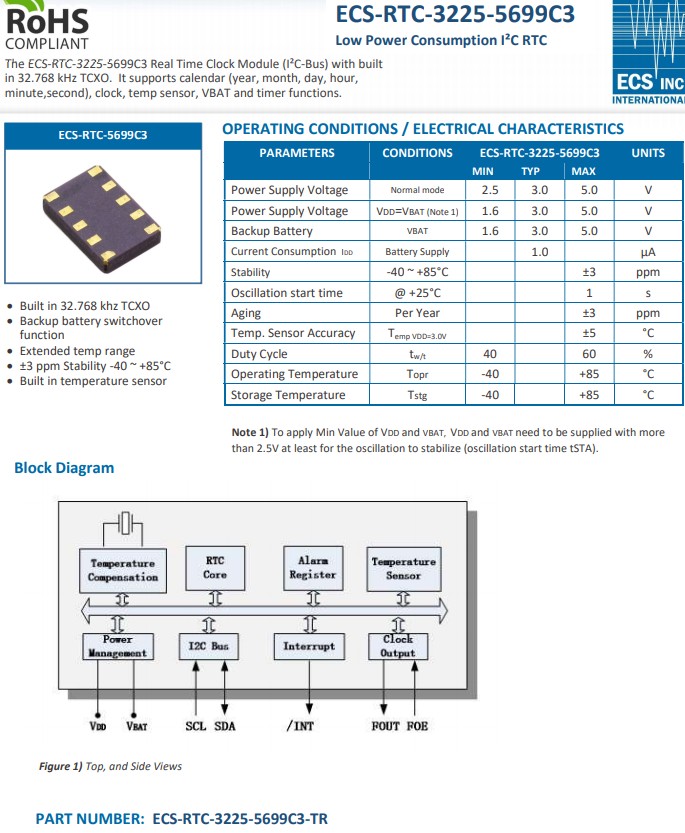 ECS-RTC-3225-5699C3是一款I(lǐng)2C總線接口實時時鐘 (RTC),具有低功耗的嵌入式32.768kHz晶振,TCXO溫補晶振。精密的溫度傳感器和溫度補償電路確保時鐘精度。RTC支持日歷、時鐘、VBAT和定時器功能。ECS-RTC-3225-5699C3采用 3.2mmx2.5mmx1.0mm封裝尺寸,10腳貼片晶振,適用于對穩(wěn)定性至關(guān)重要的便攜式、電池供電和小型電子設(shè)備。