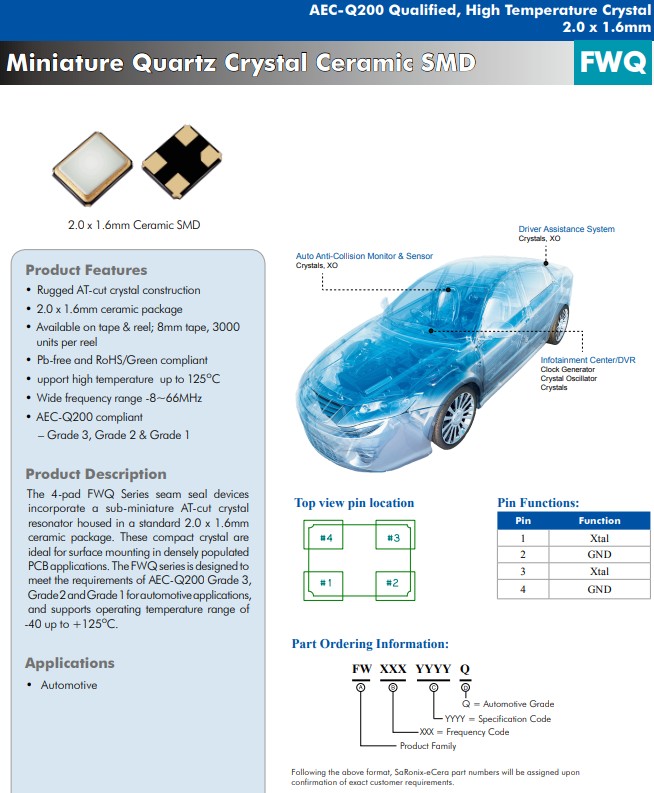 亞陶晶振4焊盤FWQ系列接縫密封裝置包含一個安裝在標準2.0x1.6mm中的超小型AT切割晶體諧振器陶瓷封裝。這些緊湊的晶體非常適合在密集的PCB應用中進行表面安裝。