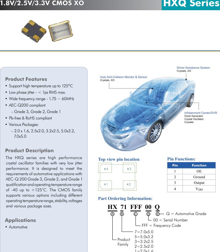HXQ系列是高性能的具有非常低抖動(dòng)的晶體振蕩器家族的性能。它是為了滿足要求與汽車應(yīng)用AEC-Q 200三級(jí),二級(jí),一級(jí)資質(zhì)和工作溫度范圍零下40到125°C。CMOS家族支持多種選項(xiàng),包括不同的工作溫度范圍、穩(wěn)定性、電壓以及各種包裝尺寸。