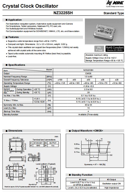 | NZ3225SH-26.000MHz | NDK晶振 | NZ3225SH | 26MHz | CMOS | 3V | ±100ppm | -40°C ~ 125°C |