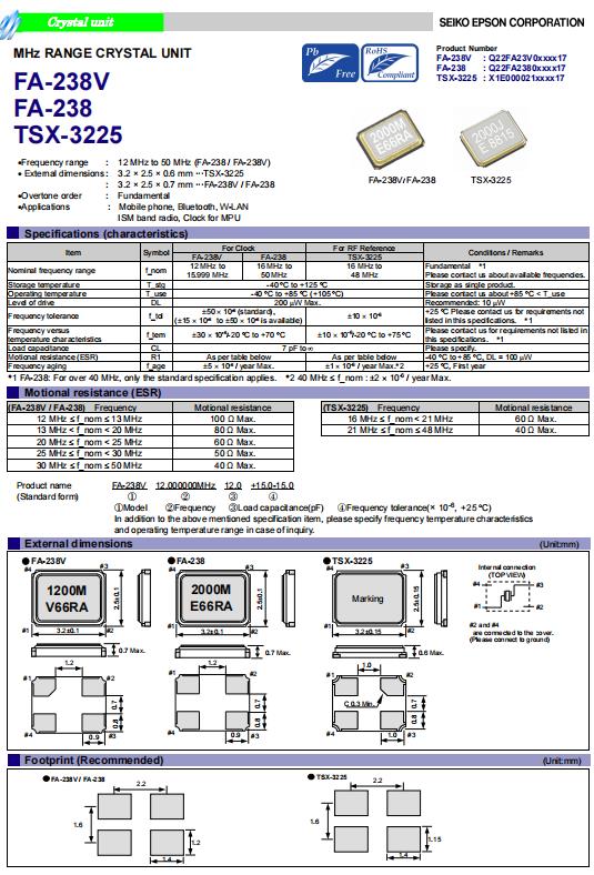 | Q22FA2380118816 | 3.2 x 2.5 x 0.7mm | FA-238 | 24.000000 MHz | 12 pF | +/-30 ppm | +/-30 ppm | -40 to +85 °C | ≤ 60 Ω |
