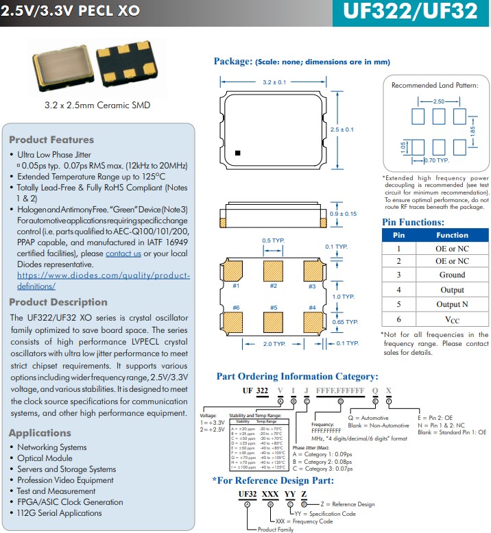 UFQ322/32 20~100 3.2x2.5x0.9 LVPECL 3.32.5 6 2.5V/3.3V、3.2x2.5mm、超低抖動(dòng)LVPECL晶體振蕩器