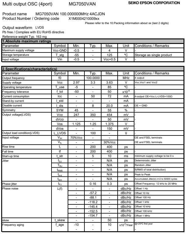 | X1M000421000700 | MG7050VAN | 156.250000 MHz | 7.00 x 5.00 x 1.60 mm | LVDS | 2.970 to 3.630 V | -5 to 85 °C |