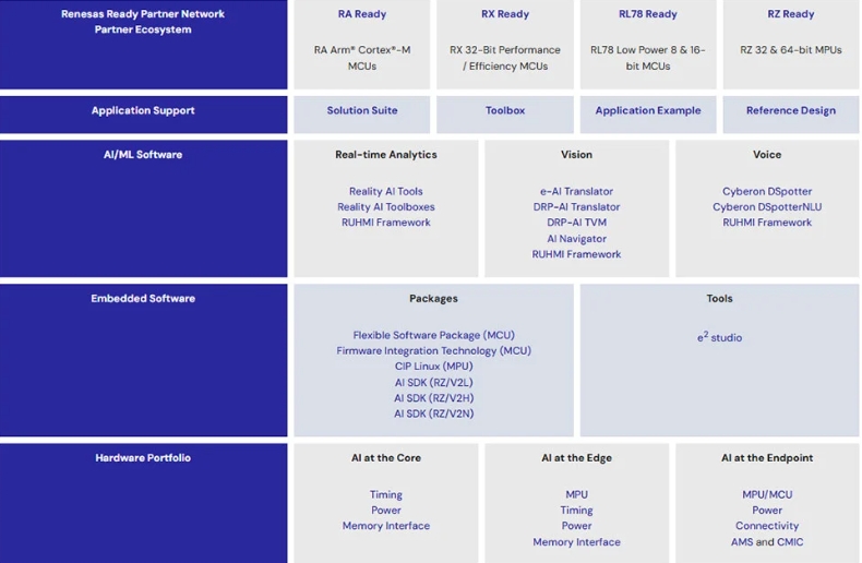 瑞薩電子深知,一個完整的AI開發(fā)生態(tài)系統(tǒng)對于推動AI技術發(fā)展和應用落地的重要性.因此,公司構建了一套全面且完善的AI開發(fā)系統(tǒng),為開發(fā)者提供從數(shù)據(jù)收集,模型訓練到部署應用的全鏈條支持.在開發(fā)工具方面,瑞薩提供了直觀易用的E-AI工具鏈和RealityAlTools.E-AI工具鏈能夠幫助開發(fā)者將現(xiàn)有AI模型輕松遷移到瑞薩平臺上,而RealityAlTools則為開發(fā)者提供了從數(shù)據(jù)到模型的一站式開發(fā)服務,大大縮短了開發(fā)周期,提高了開發(fā)效率.在硬件產(chǎn)品上,如前文所述,RA8MCU系列和RZ/VMPU產(chǎn)品線等豐富的MCU/MPU產(chǎn)品,為不同類型和規(guī)模的AI應用提供了多樣化的硬件選擇,滿足了各種復雜應用場景的需求.瑞薩還擁有豐富的解決方案資源庫,其中包含了大量的應用示例,工具箱,解決方案套件和硬件參考套件等.這些資源就像一座寶藏庫,開發(fā)者可以從中獲取靈感,借鑒成熟的經(jīng)驗,快速搭建起自己的AI應用原型.例如,在智能家居領域,瑞薩提供的智能語音控制家居自動化解決方案,詳細展示了如何利用瑞薩的硬件和軟件資源,實現(xiàn)語音識別,智能控制等功能,幫助開發(fā)者快速進入智能家居AI應用的開發(fā)領域.此外,瑞薩還積極構建廣泛的合作伙伴網(wǎng)絡,與眾多行業(yè)領先的企業(yè),科研機構和開發(fā)者社區(qū)建立了緊密的合作關系.通過與合作伙伴的深度協(xié)作,瑞薩能夠整合各方優(yōu)勢資源,共同開發(fā)出更具創(chuàng)新性和競爭力的AI解決方案.這些合作伙伴不僅提供了商業(yè)級的解決方案,還在技術交流,市場推廣等方面與瑞薩攜手共進,共同推動AI技術在各個領域的普及和應用.總之,瑞薩完善的AI開發(fā)系統(tǒng),就像一個強大的"AI孵化基地",為開發(fā)者提供了全方位的支持和保障,助力他們快速實現(xiàn)從原型到應用的轉化,加速AI技術的創(chuàng)新與發(fā)展.