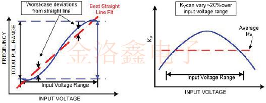 通常以kHz/伏特,MHz/伏特,PPM/伏特或類似單位表示.根據(jù)PLL設(shè)計(jì)中使用的術(shù)語(yǔ),斜率通常稱為"KV".基于石英晶振的標(biāo)準(zhǔn)VCXO的FV特性斜率可能會(huì)在輸入控制電壓范圍內(nèi)發(fā)生較大變化,通常為10-20%.一些數(shù)據(jù)手冊(cè)可能會(huì)指定一個(gè)"平均"Kv作為典型值,但由于Kv影響重要的PLL性能參數(shù),例如帶寬和相位裕量,因此,在成功的設(shè)計(jì)中必須了解并考慮整個(gè)Kv變化.