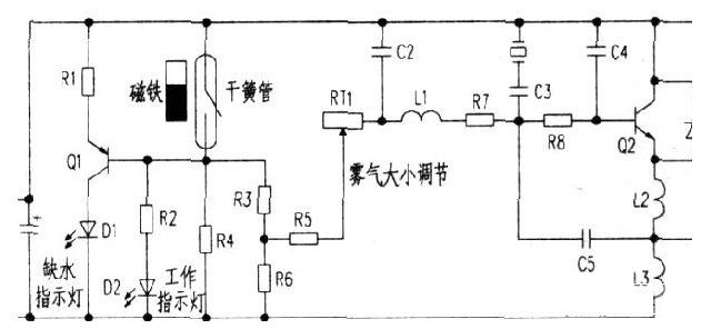 是否很是好奇,加濕器怎可奈何的了空氣,那我們一起看看加濕器的工作原理吧!你就會(huì)有所領(lǐng)悟的。加濕器一般采用超聲波方式將水霧化,并通過風(fēng)機(jī)將霧化的水汽吹出殼體,從而達(dá)到加濕空氣的效果,其電氣原理圖如附圖所示。市電經(jīng)過開關(guān)電源后,輸出兩路電壓36V和12V。其中36V供電水汽霧化模塊.12V供電風(fēng)機(jī)。電路中,D1、D2分別是缺水指示燈和工作指示燈;干簧管為液位檢測(cè)開關(guān);RT1為霧氣大小調(diào)節(jié)電位器。以02為核心及其外圍電路為超聲波發(fā)生電路。