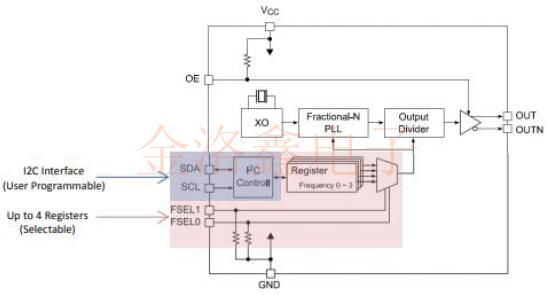 該石英晶體振蕩器系列由SPXO,小數(shù)N分頻PLL,LVPECL輸出緩沖器和輸出使能組成.可選選項(xiàng)最多具有4個其他寄存器,這些寄存器是預(yù)編程的或用戶可編程的,用戶可以從中選擇.用戶可編程選件具有I2C控制塊,可根據(jù)需要對頻率進(jìn)行重新編程.