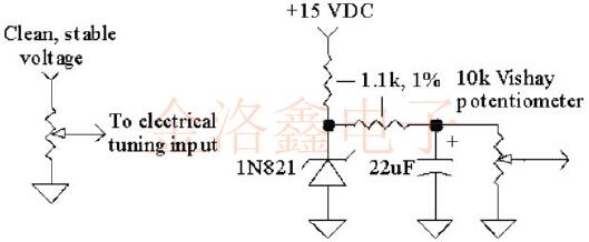作為一種選擇,可以將振蕩器的內(nèi)部參考電壓引致一個引腳上,以連接到多圈電位計以進行微調(diào).或者,可以將來自單獨電源的干凈DC施加到電調(diào)諧銷上.如果可用電源有噪聲或不穩(wěn)定,則可能需要添加一個齊納二極管或參考設(shè)備以及一個低通噪聲濾波器.溫度補償齊納二極管(如1N821)是提供良好溫度穩(wěn)定性和極低噪聲的絕佳選擇(在大多數(shù)情況下),以下所示的22uF濾波電容器可省去.參考設(shè)備具有出色的穩(wěn)定性,但它們通常具有相當高的噪聲電壓,因此建議進行額外的濾波器. 這里有幾點要考慮: