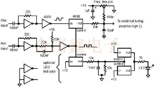 以下電路使用相同的Wenzel晶振技術(shù),僅使用兩個CMOS器件,一個4069十六進制反相器和一個4016或4066模擬開關(guān).頻率微調(diào)電位器在不存在基準的情況下控制頻率.該電路還包括一個LED驅(qū)動器,用于指示外部參考信號的存在.組分值不是特別關(guān)鍵,并且最佳值將取決于應(yīng)用. 所示電路是具有最高精度振蕩器的一階環(huán)路.例如,一個10MHz的烤箱振蕩器調(diào)諧靈敏度可能為每伏特1Hz,如果使用15V電源,則相位斜率約為每弧度3伏特.一階環(huán)路的帶寬是調(diào)諧靈敏度和相位斜率的乘積(1Hz/伏×3伏/弧度=3Hz),該斜率遠低于10K和10nF網(wǎng)絡(luò)的滾降頻率.如果振蕩器具有更高的調(diào)諧靈敏度,則帶寬將成比例地更高,并且可能需要二階響應(yīng)來減少外部參考噪聲.盡管可以添加傳統(tǒng)的有損集成運算放大器類型2電路,在沒有基準的情況下,有必要采取其他措施來控制頻率,因為積分器將趨向于漂移至供電軌之一.