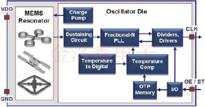 MEMS振蕩器由與模擬振蕩器IC封裝在一起的MEMS諧振器芯片組成.如圖1左側(cè)所示,有不同類型的MEMS諧振器可滿足不同的應(yīng)用需求.MEMS諧振器連接到模擬IC上的MEMS Oscillator專用電路塊,并通過靜電激勵驅(qū)動.