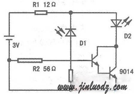 下圖的電路非常簡(jiǎn)潔,2只NPN三極管組成復(fù)合管用于放大被測(cè)的遙控器紅外光信號(hào),D1用扁平紅外線光敏二極管,D2用紅色圓型發(fā)光二極管,Rl為D2限流電阻,R2為遙控器上IC輸出限流電阻,R3與Dl組成分壓電路目的是泄掉Dl的反向穿透電流。如沒有R3,D2將長(zhǎng)亮。電阻可使用1/8W的。