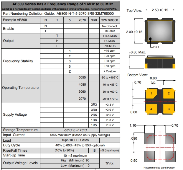 anderson安德森2520貼片晶體振蕩器AE809-N-T-5-2070-3R0-32M768000