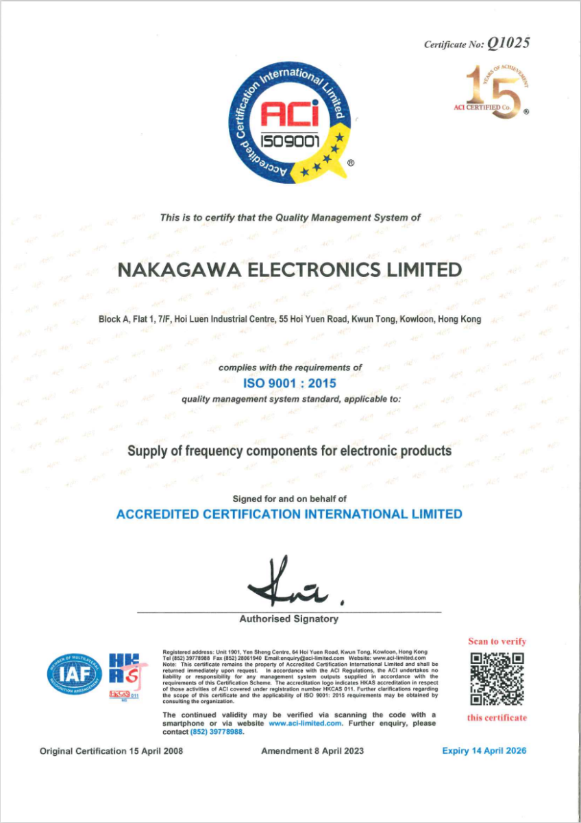 NAKAGAWA ELECTRONICS LIMITED (NKG晶振)致力于提供高質(zhì)量的產(chǎn)品,并因此維護(hù)質(zhì)量和管理體系,以確保能夠保證這一點(diǎn)。不僅對我們的客戶,而且對我們自己的員工和社區(qū),我們以最高的法律和道德標(biāo)準(zhǔn)協(xié)調(diào)我們的所有活動(dòng),履行社會(huì)責(zé)任。我們公司的運(yùn)作是參照相關(guān)的企業(yè)管治準(zhǔn)則和包括EICC行為準(zhǔn)則在內(nèi)的國際標(biāo)準(zhǔn)來制定和更新的。中川電子有限公司(NKG)香港總部以ISO 9001為基礎(chǔ)運(yùn)作生產(chǎn)石英晶體諧振器,并定期接受審核。您可以在這里查看證書。我們的生產(chǎn)基地除了擁有兩個(gè)體系資質(zhì)外,還擁有更先進(jìn)的設(shè)置,涵蓋了TS 16949和全面的健康和安全程序(基于OHSAS要求)。除了強(qiáng)制性的內(nèi)部XRF測試(基于QC080000模型)外,工廠還運(yùn)行了一個(gè)擴(kuò)展系統(tǒng),以確保我們的產(chǎn)品符合環(huán)境要求。